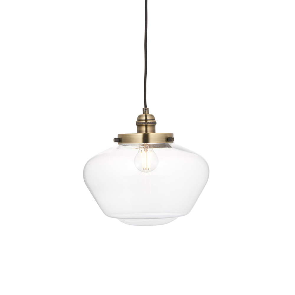 A timeless “school house” styled pendant in antique brass with clear glass, ideal for the kitchen, above a breakfast bar or dining table. Hang individually or in a set of three. Matching semi flush also available.