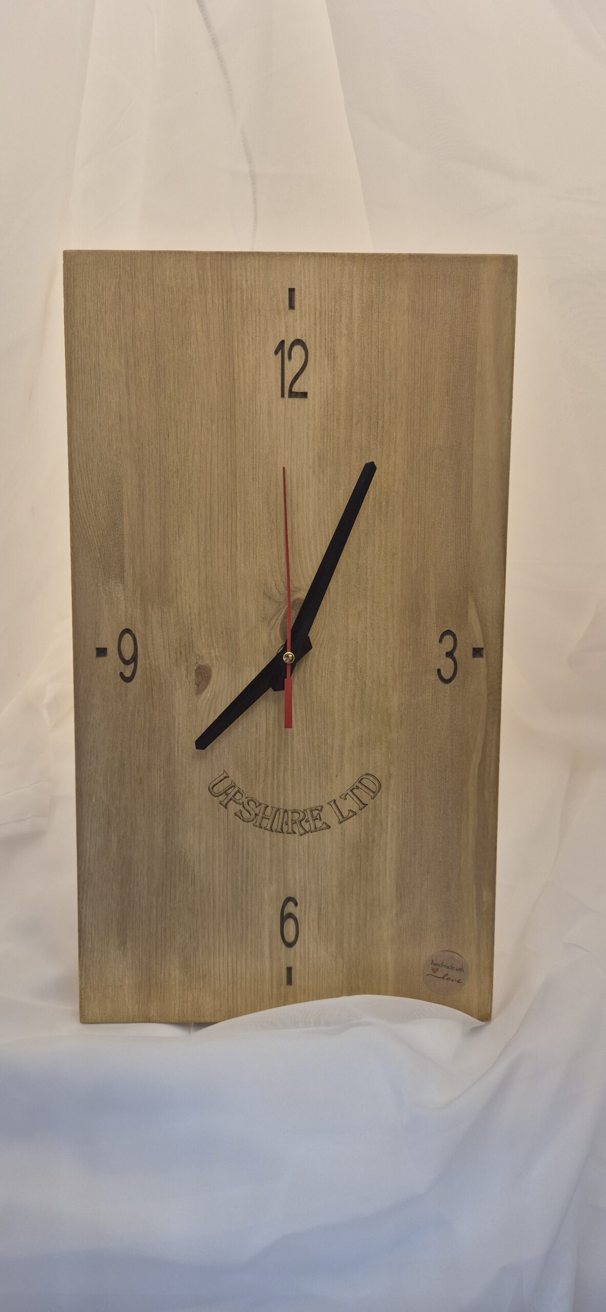 A modern twist on an old style solid pine clock. Up todate design with black and red hands, finished in antique bee’s wax. Engraving of your choice €20.00 extra.